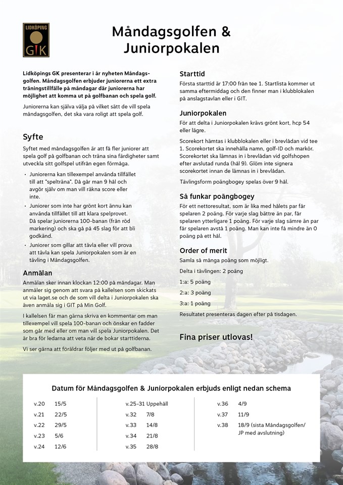 Lidköpings GK presenterar i år nyheten Måndagsgolfen! Måndagsgolfen erbjuder juniorerna ett extra träningstillfälle på måndagar där juniorerna har möjlighet att komma ut på golfbanan och spela golf. Juniorerna kan själva välja på vilket sätt de vill spela måndagsgolfen. Det ska vara roligt att spela golf. Juniorpokalen är en tävling som ingår i Måndagsgolfen. För mer information se bilden eller gå in på Lidköpings GK:s hemsida och läs under Aktuellt. Anmäl via länken nedan. Anmälan Juniorpokalen GIT Vi ses på golfbanan! //Ledarna Grupp Svart 1 9 maj 2023 0kommentarer