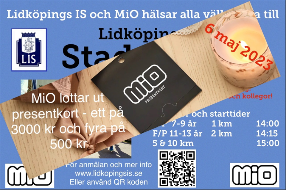 Vid Stadsloppet den 6/5 kommer det lottas ut fina vinster från MiO bland samtliga startande. 1st presentkort på 3000 kr och 4 st på 500 kr. Detta vill ni inte missa! Glöm inte att ni som betalande medlemmar springer gratis, ange koden LIS vid anmälan. Anmälan senast 3/5. Ta chansen! Välkomna! Juniorgruppen 23 apr 2023 0kommentarer