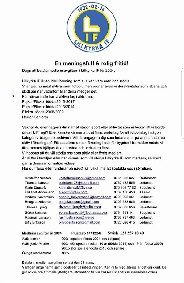Klicka på bekräftelselänken i det mejl vi skickat dig för att börja ta emot uppdateringar från Lillkyrka IF P/F-16/17.