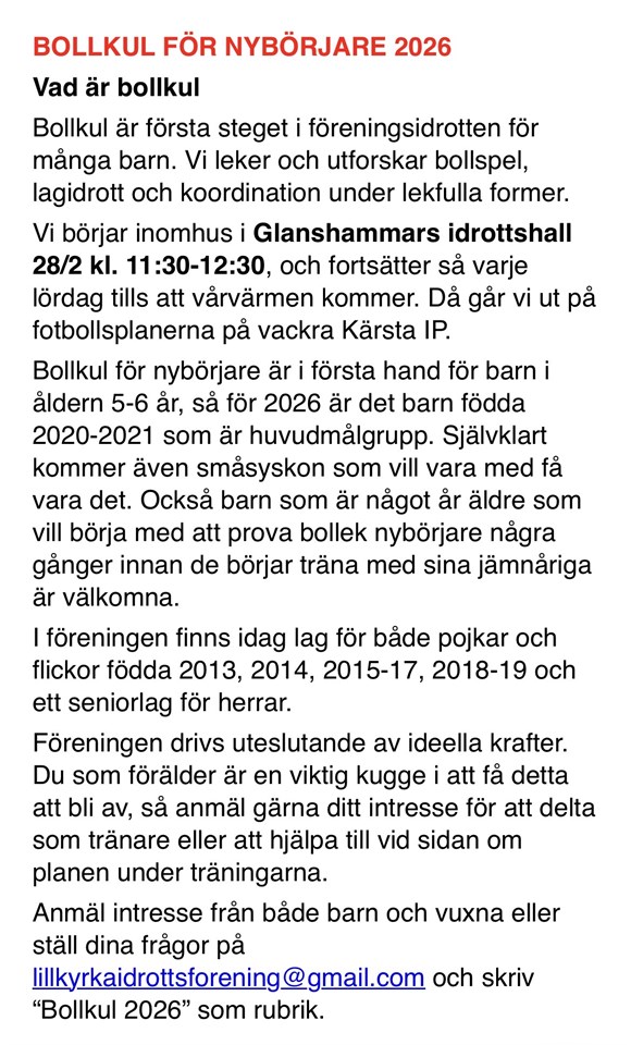 Klicka på bekräftelselänken i det mejl vi skickat dig för att börja ta emot uppdateringar från Lillkyrka IF P/F-18/19.