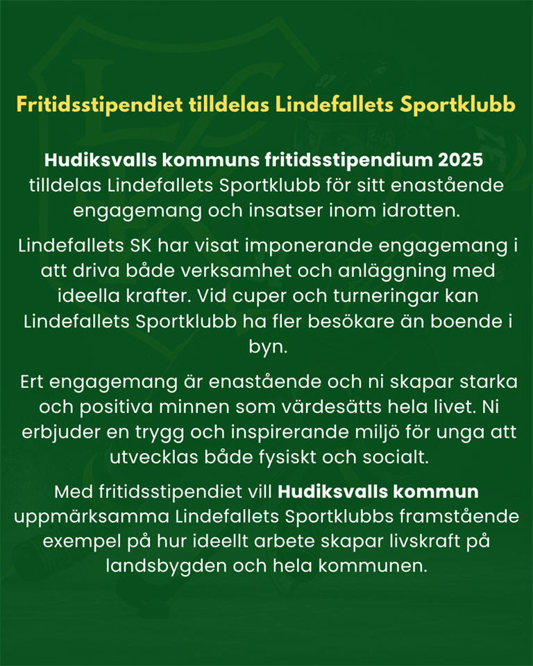 Vi är otroligt stolta och glada över att Lindefallets SK har tilldelats kommunens fritidsstipendium 2025!