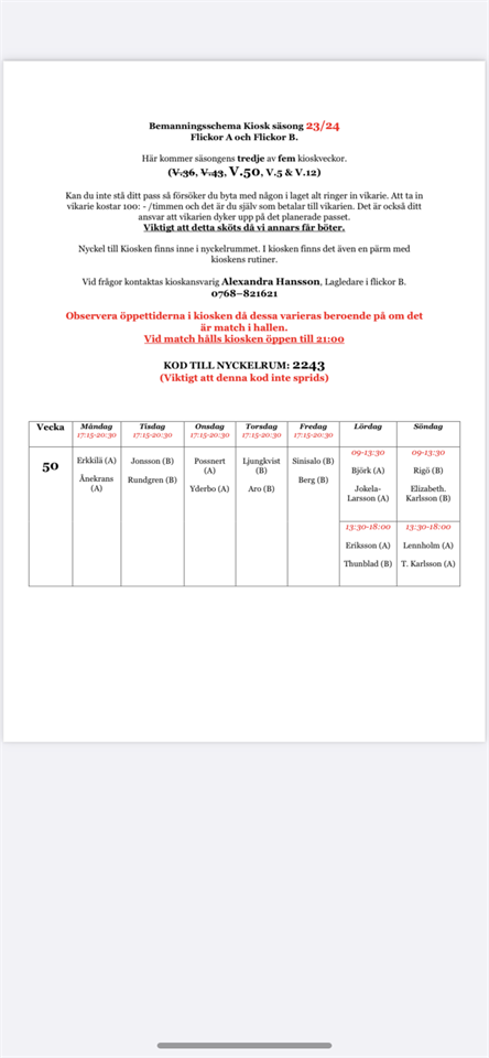 Nu har jag fått kioskschemat från Flickor A