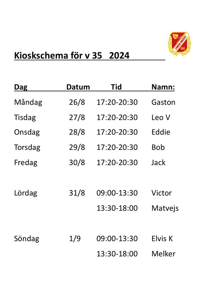 Vi blir tvungna att flytta vårat föräldrarmöte till 4 Septerber istället, då Linden har lagt in en tränarträff gör alla tränare den onsdag (28/8) vi skulle ha haft vårt möte. Hoppas att ni kan komma då istället. Vill även påminna er om att vi har kioskpass vecka nästa vecka (v35). Det finns en lista vilka man får ringa ifall man vill sälja sitt kassa pass. Den finns under dokument 24/25, extrajobbade för kassapass. . // Jimmy Lag 11 23 aug 2024 0kommentarer