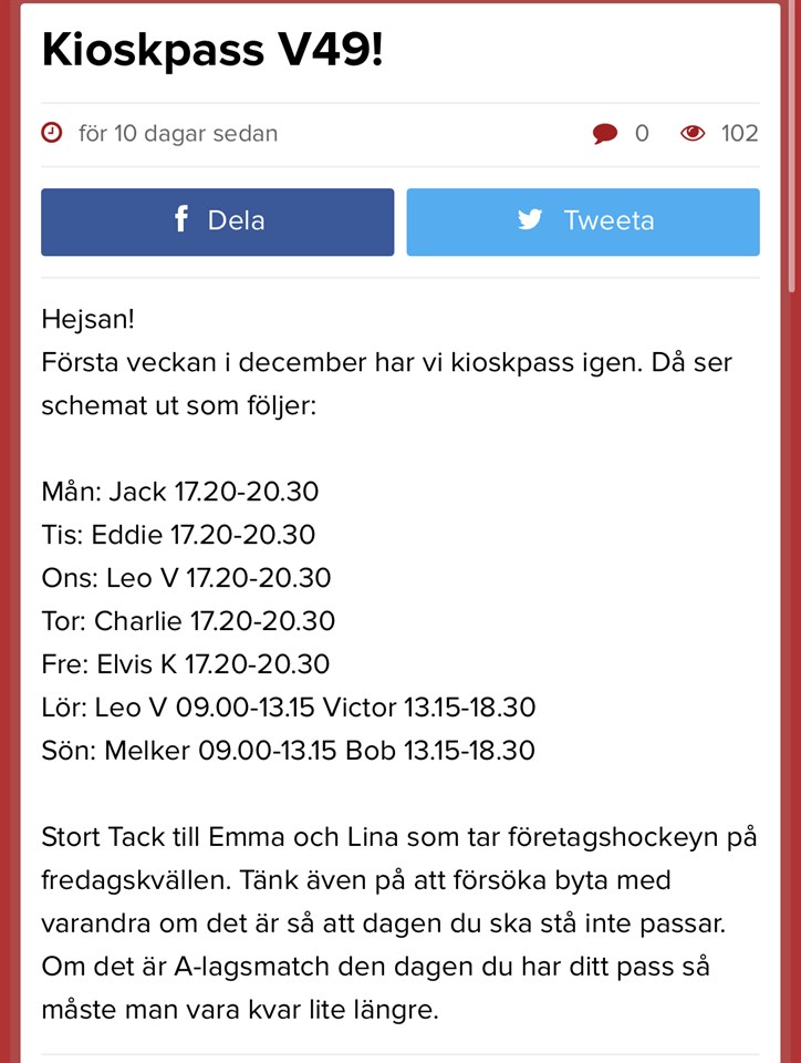 Hejsan! Första veckan i december har vi kioskpass igen. Då ser schemat ut som följer: Mån: Jack 17.20-20.30 Tis: Eddie 17.20-20.30 Ons: Leo V 17.20-20.30 Tor: Charlie 17.20-20.30 Fre: Elvis K 17.20-20.30 Lör: Leo V 09.00-13.15 Victor 13.15-18.30 Sön: Melker 09.00-13.15 Bob 13.15-18.30 Stort Tack till Emma och Lina som tar företagshockeyn på fredagskvällen. Tänk även på att försöka byta med varandra om det är så att dagen du ska stå inte passar. Om det är A-lagsmatch den dagen du har ditt pass så måste man vara kvar lite längre. Lag 11 17 nov 2024 0kommentarer