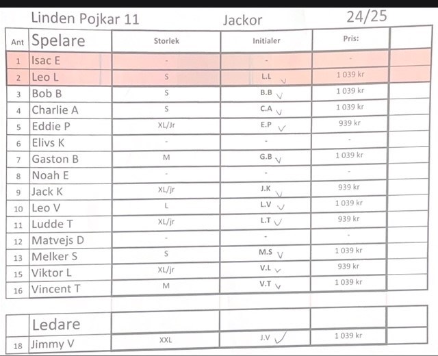 Hej. Nu har dom nya Linden jackorna kommit. Jag tar med mig dom till träningen ikväll. På listan så ser ni vad jackorna kostar. Ni swishar till laget ( 123 446 55 22 ). Märker det med spelarens namn. Det ska vara inbetalt senast onsdag den 18:e december. Med vänlig hälsning Jimmy Lag 11 6 dec 2024 0kommentarer