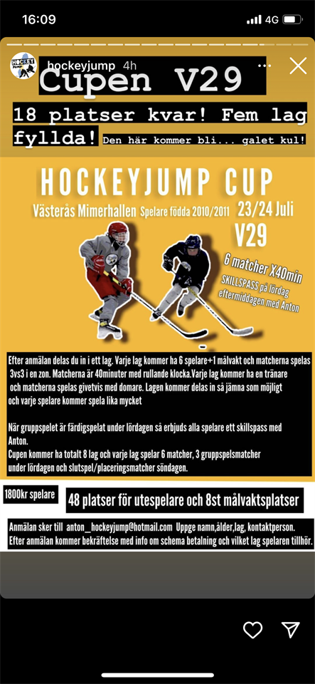 Hej Vi har fått en inbjudan till att delta i Lasse Björn Cup som anordnas i Mälarhöjdens Ishall av Djurgården den 27 augusti. Jag har lagt ut en kallelse som intressekonflikt för att delta. Vi behöver ha ditt svar så fort som möjligt för att avgöra om vi har möjlighet att delta. Anmälningsavgiften bekostas av Lagets kassa men spelaravgiften på 350kr får spelaren själv stå för. Med vänlig hälsning, Ledarna Lag 11