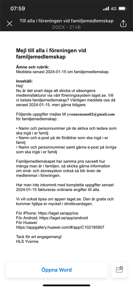 Hej, Nu skickas faktura på medlemsskap i klubben ut. Vill man vara familjemedlem mailar respektive familj till Yvonne enligt bifogad bild. Kostnad 1 200:- Vanligt medlemsskap sker automatiskt. /Ledarna P 2015 P-2015 9 jan 2024 1kommentar