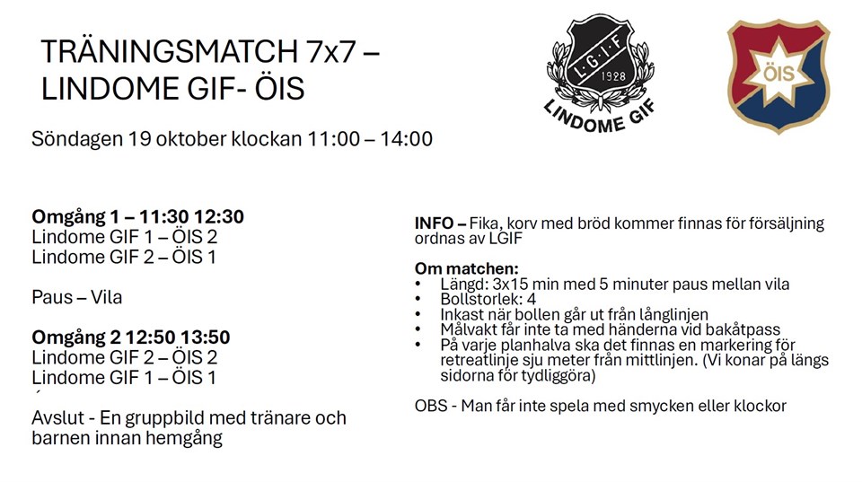 Nu till helgen kickar vi igång vår träningsmatch mot ÖIS. Det ska bli kul att få spela på 7x7 manna och träna inför nästa års seriespel. Se bifogad bild kring information om dagen.