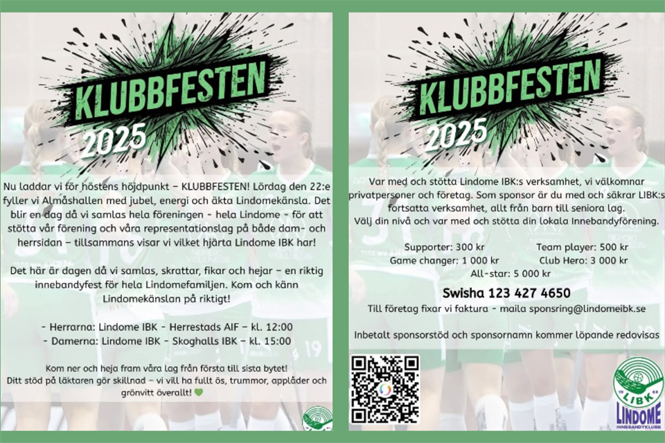 Nu laddar vi för årets höjdpunkt – KLUBBFESTEN! Lördag den 22:e fyller vi Almåshallen med jubel, energi och äkta Lindomekänsla. Det blir en dag då vi samlas hela föreningen - hela Lindome - för att stötta vår förening och våra representationslag på både dam- och herrsidan – tillsammans visar vi vilket hjärta Lindome IBK har!