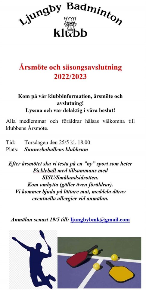 Torsdagen den 19/5 är det ingen träning. Sista vanlig träningen är på tisdag den 23/5 ordinarie tider. På torsdagen 25/5 har vi årsmöte och avslutning i Sunnerbohallen! Glöm inte att anmäla er senast fredag 19/5! Motions spel & Tävlingsgrupp 16 maj 2023 0kommentarer