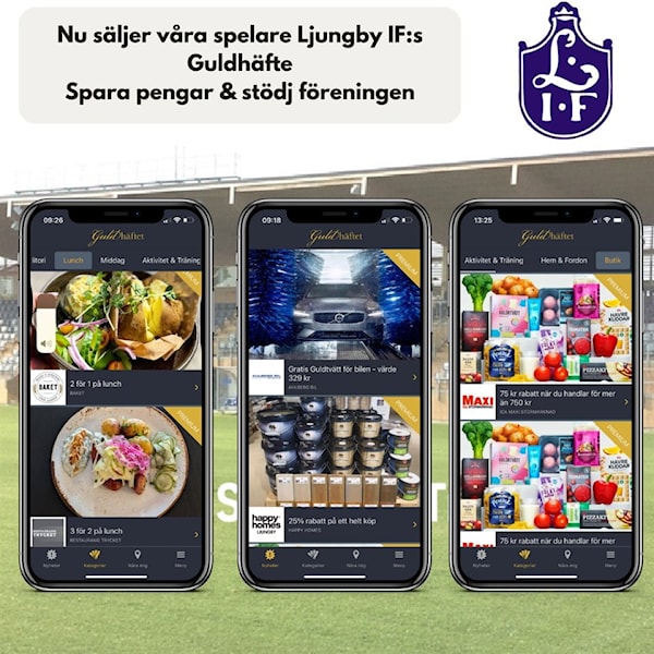 Guldhäftet är ett lokalt kuponghäfte som ger köparen massvis med fina rabatter samtidigt som man sponsrar föreningen. Till exempel kan köparen spara in 225 kr genom att använda rabatter vid handling på ICA Maxi. Andra sponsorer i häftet med fina rabatter är Baket, Elon, Happy Homes, Profilhörnan, Workout och Ahlbergs bil. Du ser alla rabatter/sponsorer då du går in och registrerar dig som säljare. Du kan gå in och läsa om guldhäftet genom att följa/kopiera denna länk https://www.guldhaftet.se/ljungbyif Här finns all information samlad.