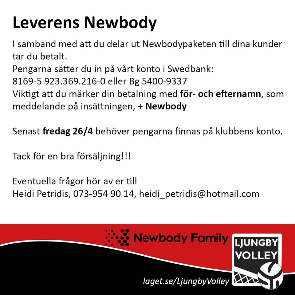 Leverens Newbody I samband med att du delar ut Newbodypaketen till dina kunder tar du betalt. Pengarna sätter du in på vårt konto i Swedbank: 8169-5 923.369.216-0 eller Bg 5400-9337 Viktigt att du märker din betalning med för- och efternamn, som meddelande på insättningen, + Newbody Senast fredag 26/4 behöver pengarna finnas på klubbens konto. Tack för en bra försäljning!!! Eventuella frågor hör av er till Heidi Petridis, 073-954 90 14, heidi_petridis@hotmail.com A-lag Damer 25/26 2 apr 2024 0kommentarer