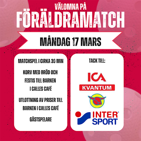 Välkomna till föräldramatch på er ordinarie träningstid under vecka 12. Ni spelar match mot era föräldrar, sen ses vi med laget uppe i Calles Café för korv med bröd och festis samt utlottning av fina priser!