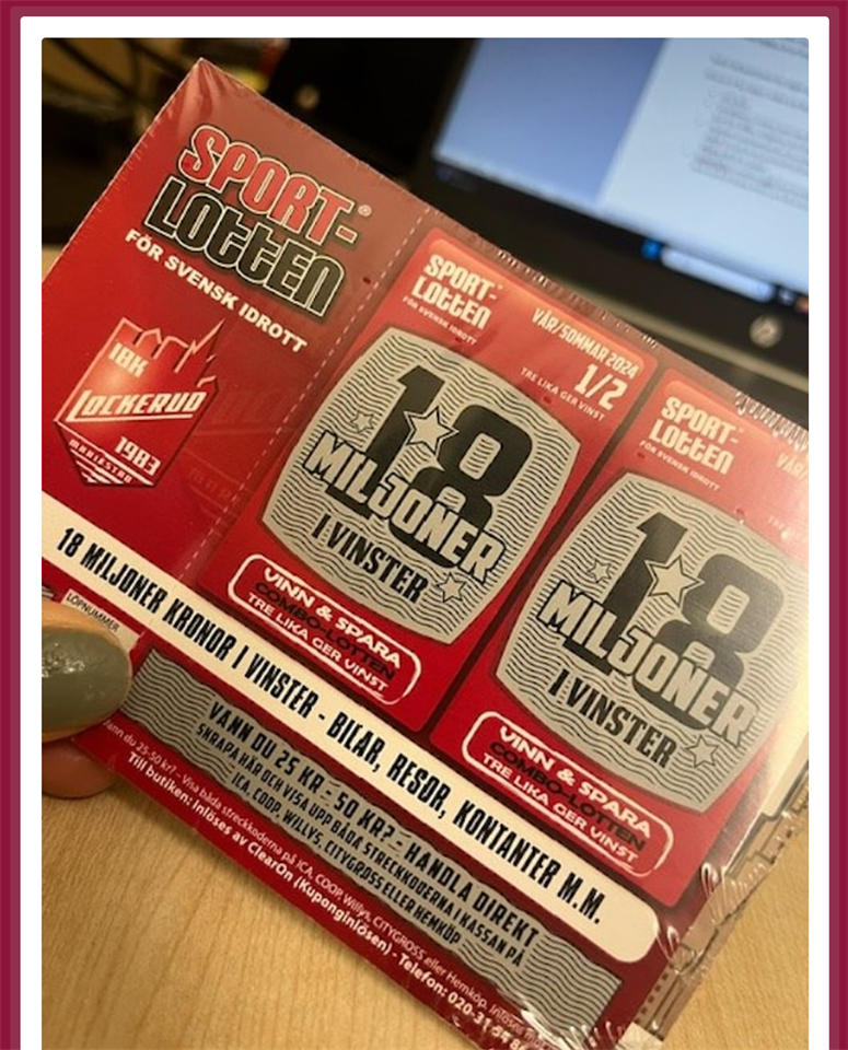 Dax för lite mer lotter. Varje spelare kommer få 12 lotter á 50:-, totalt 600:- Jag kommer dela ut lotterna på träning imorgon onsdag 31/1. Önskar att ni swishar mig, 070 339 53 56, för lotterna senast 20/3. Mer info nedan "Sportlotteriet våren 2024, nu kommer Lockerudlotten! Vi i klubben ska gemensamt sälja 4000 lotter. Det kan låta som en enorm summa, men vi är många som hjälps åt. Pengarna går bland annat till utbildningar, hyror, domararvoden, matchställ och bussresor. Innebandyskolan behöver inte sälja lotter, men resterna lag ska sälja enligt följande: Dam- och herrlag 20 lotter/spelare Damjunior- och herrjuniorlag 20 lotter/spelare Barn och ungdomslag 12 lotter/spelare Att senior- och juniorlag ska sälja fler lotter är barn- och ungdomslagen beror på att de kostar mer under säsongen än barn- och ungdomslag. Familjer med fler än 2 barn säljer för 2 barn. Det yngsta barnet behöver inte sälja (men får gärna). Vad är då Sportlotten för något nytt? Flera av er har säkert redan sett den hos andra föreningar, men här är en kort presentation av lotten: Pris 50 kr Vinst på var 5:e lott 18 miljoner i vinster, och om du vinner 25-50 kr kan du använda streckkoden direkt i kassan hos ICA, Willys, Citygross och Hemköp. Förutom vinstchansen har du också tillgång till 4 kuponger från ICA Oxen, Mio, Dinners och OKQ8. För att ta ett exempel så tjänar du in lottpriset direkt genom ett köp på Oxen då du har tillgång till 50 kr rabatt. Rabatthäfte i mobilen ingår. Det innebär att du får rabatter från anslutna företag som inte finns med på fysiska lotten och då också i andra städer. Frågor? Kontakta klubbchef Elin Werner klubbchef@lockerud.nu 073-500 62 29"