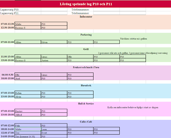 I bifogad bild ser ni schema för arbetspassen på VPC 5/10. Om nån inte kan ett visst pass kan ni ju kommentera nedan så hoppas vi att det går att byta med någon annan. Som ni ser behövs alla för att vi ska få ihop det. (OBS! Olle och Linus har fått två kortare pass var istället för ett längre, hoppas det fungerar.) Jag ligger inte utlagd på nåt enskilt pass men kommer vara där hela dagen och hoppa in där det behövs. (Cupledningen har bestämt att det ska vara så..)