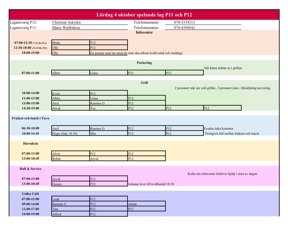 Hej på er! Det är snart dags för Vänerns Pärla Cup. Det är ju föräldramöte på söndag och då kommer lite mer info men jag måste lämna in schemat för våra arbetspass redan på fredag. Jag har därför gjort ett förslag som ni ser i bifogad bild. Några av er har så kallad delad tur, det är för att det ska bli någorlunda rättvist i hur många timmar alla jobbar men också för att få ihop schemat.. Hugo och Mio som är nya - ert pass i matsalen kommer troligtvis bli något kortare. Jag har satt dubbla pass på mig själv så ni kanske får avlasta mig lite beroende på hur tiderna blir. :) Jag vore tacksam om alla kunde kommentera inlägget om tiderna ser okej ut för er eller inte. // Marie