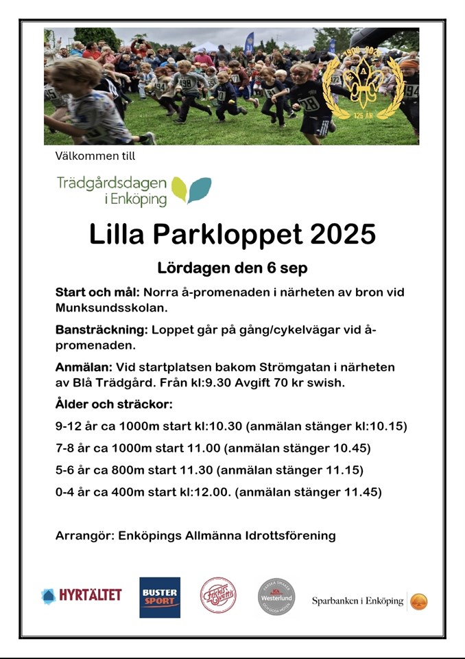 Nästa lördag den 6 sep arrangerar vi Lilla Parkloppet på Trädgårdsdagen i Enköping Vi hoppas att vi kan få ihop tillräckligt med funktionärer. Sjukvårdare är klart; Sanna och Pävi Anmälan/nummerlappar har vi tre stycken just nu men skulle behöva vara en eller två till. Vi behöver ha 16 flaggvakter totalt och är nu fyra som anmält sig. Så hoppas fler av er kan komma och hjälpa till. Brukar vara en inte så jobbig insats för föreningen utan tvärt om ganska kul! Plats vid Blå Trädgård vid Lilla bron till Munksundsskolan 9.30 Samling funktionärer-genomgång av banan. 10.30 Första start 12.00 sista start 13.00 Allt klart! Bifogar inbjudan som ni kan sprida. Men där står även alla tider och sträckor för alla lopp. Anmäl till mig Madde, 073-57 09 728 eller i chatten. Löpargruppen EAI 29 aug 0kommentarer