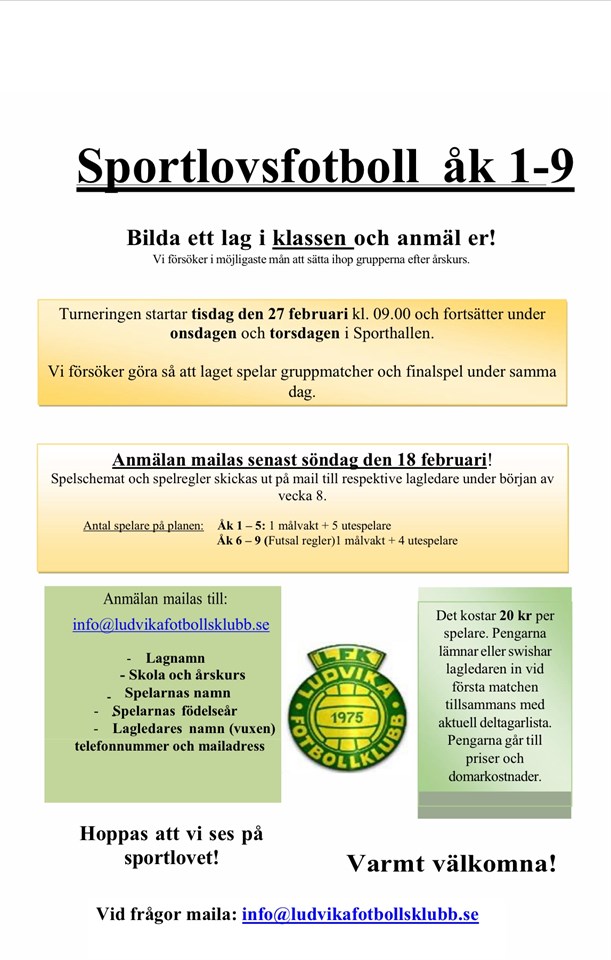 Det börjar närma sig årets SPORTLOVSFOTBOLL! Vi hoppas återigen kunna få hundratals barn och ungdomar att delta och med fyllda läktare brukar det vara en höjdpunkt för många på Sportlovet! 🌟🌟🌟🌟 Anmälan till: info@ludvikafotbollsklubb.se Ludvika FK 2 feb 2024 2kommentarer
