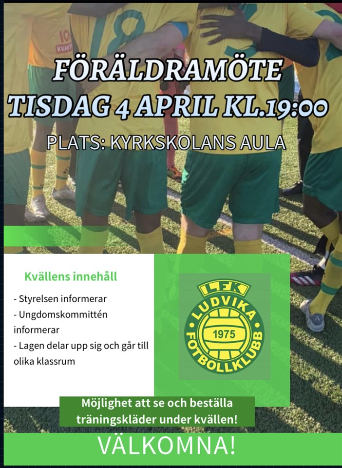 Vi hälsar alla föräldrar välkomna på möte tisdag den 4/4 kl.19:00 i Kyrkskolans aula. - Styrelsen informerar - Ungdomskommittén informerar - Lagen delar upp sig och går till olika klassrum Under kvällen finns möjlighet att beställa träningskläder! Ludvika FK 26 mar 2023 0kommentarer