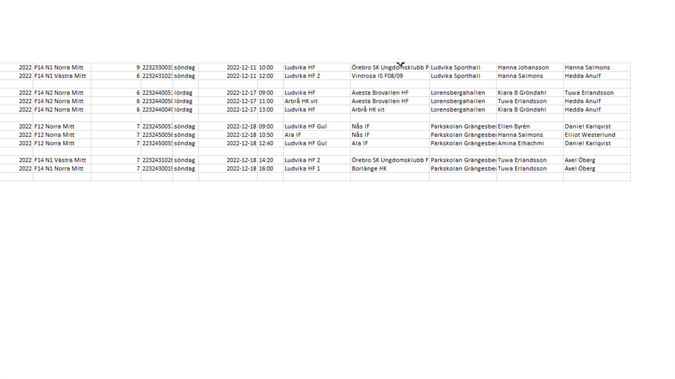 Hej, Jag har gjort ett utdrag på de matcher som är kvar innan årsskiftet i föreningen. Titta gärna igenom och se att ni kan om ni är uppsatta på någon match (om det är svårt att se här ta fram schemat under dokument), se om ni kan byta om ni inte kan och meddela mig. Jag registrerar ändringar och laddar upp nytt schema varje gång så schemat är uppdaterat. Hälsningar Emma