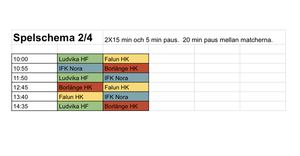 Hej på er, Bifogar spelschemat för den 2/4. Vi samlas i sporthallen klockan 9.15 för uppvärmning och ombyte. Efter vi avslutat sista matchen så bjuder jag på fika. Kommer inte bli något med nötter i då vi har personer som är allergiska, skulle ni vara känsliga mot något annat så får ni säga till. Det kommer finnas en kiosk där vi säljer dryck, fika och toast under matcherna. P12/13 (U14) 16 mar 2023 0kommentarer