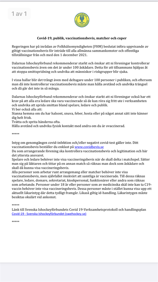Observera direktiv från Skogsbo som gäller imorgon: "Sena och nya direktiv från förbundet. Alla över 18 år behöver visa covid pass och Legitimation" Se även bifogad bild om nya riktlinjer från Dalarnas hockeyförbund. Team -12 10 dec 2021 0kommentarer