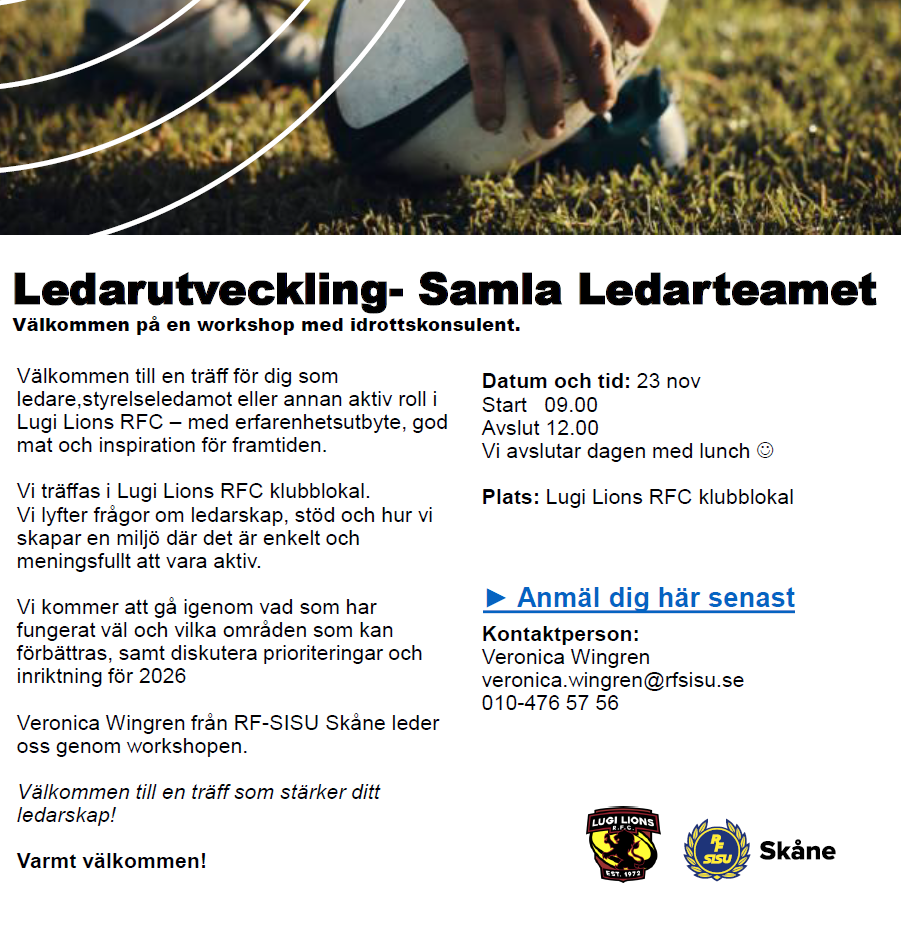Välkommen till en träff för dig somledare,styrelseledamot eller annan aktiv roll iLugi Lions RFC – med erfarenhetsutbyte, godmat och inspiration för framtiden.