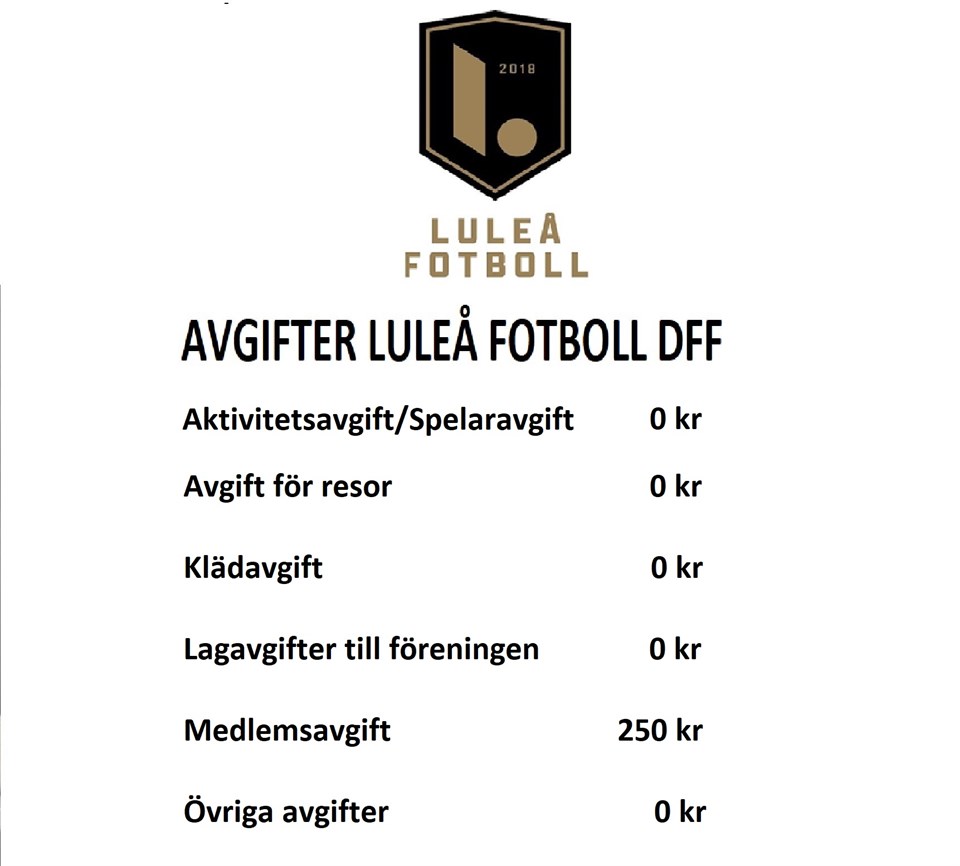 Styrelsen har beslutat om följande avgifter : Vi lägger ut det under fliken "DOKUMENT". Du hittar den under fliken "MER" längst ut t.h. på vår föreningssida (laget.se) Aktivitetsavgift / Spelaravgift / Deltagaravgift (Avgiften har olika namn i olika föreningar) 0 kr Klädavgift 0 kr Avgift för resor 0 kr Lagavgifter till föreningen 0 kr Medlemsavgift 250 kr Övriga avgifter 0 kr Styrelsen Luleå Fotboll 15 sep 2023 0kommentarer