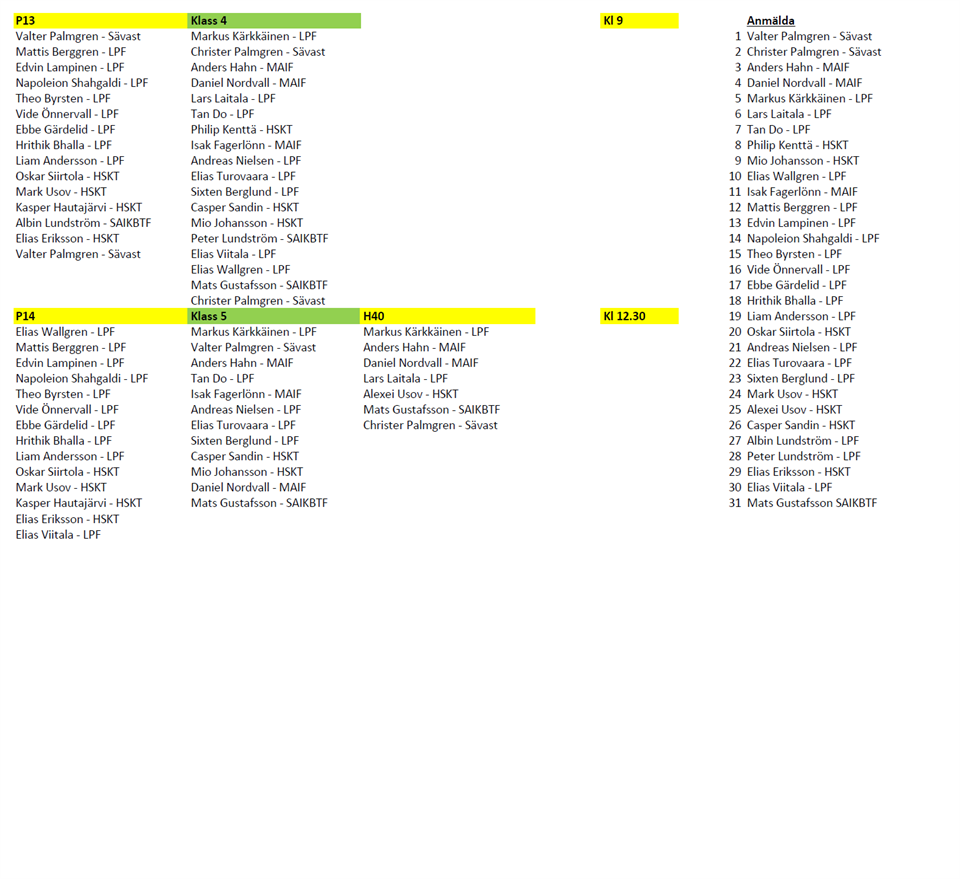Följande spelare är anmälda till DM på lördag: Mattis Berggren Edvin Lampinen Napoleon Shahgaldi Theo Byrsten Vide Önnervall Ebbe Gärdelid Hrithik Bhalla Liam Andersson Första passet börjar kl 09.00 på plats i Haparanda. Under timmen före är det uppvärmning så vi samlas senast kl 08.30 på plats inne i hallen. Jag är på plats och sätter upp ett "basläger" där vi har en roll-up med klubbens logga mm. Vi behöver räkna med att inte kunna lämna hallen förrän efter 14-15-tiden när sista passet är klart. Jag vill därför att föräldrar till Hrithik, Edvin, Theo och Liam ordnar förtäring åt alla åtta spelare på plats i hallen. Förslagsvis görs en pastasallad eller liknande som spelarna kan äta av när det sker en lucka under dagen. Förslagsvis används föräldraslingen per sms för att planera detta. Lite info om tävlingen: Tävlingslokal: Idrottshuset A-hallen, Åkergatan, 95331 Haparanda Tävlingsform: Singelklasser spelas med poolspel. Alla matcher spelas i bäst av 5 set Coachning och timeout är tillåten. Lottning sker på morgonen Domare: Spelarna dömer själva fram till finalen. Klasserna är enligt bild. Vi kommer informera spelarna mer om hur det går till i samband med tränningen imorgon onsdag. D-grupp 9 nov 2021 0kommentarer