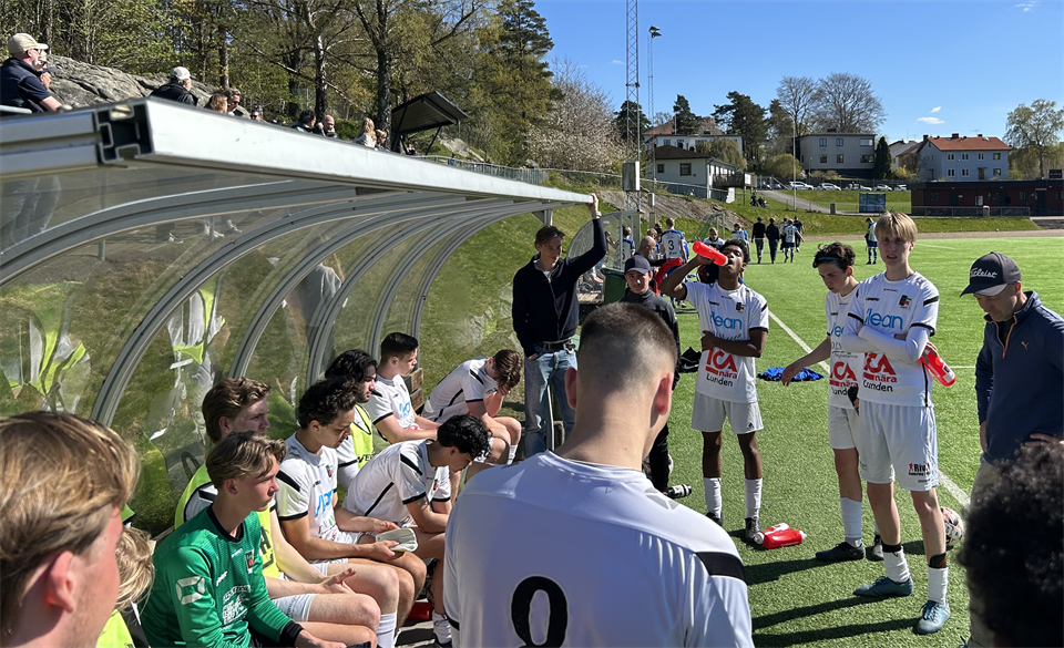 Högsommarvärme, bra med publik, alla chanser att få uppleva en söndagsmatch på Överåsvallen med våra Juniorer med siktet på tre poäng. Tyvärr landar vi i en förlust, dock lärorik sådan, som var jobbig. Tyst stämning i omklädningsrummet efter match, medan segersång hördes från gästerna på avstånd. En för dagen rätt nykompenerad startelva kommer ut och inleder med kontrollerat spel offensivt, bra trygghet och tempo i vår uppbyggnad och en trygghet samt riktigt bra press i det defensiva. Angered bjuder upp till en bra kamp, och bra spel, dock utan att skapa några verkliga chanser som sätter Daniel på prov. I minut 6 får vi en hörna som Felix nickar/örar/axlar mot mål, men deras keeper kan hyfsat enkelt plocka in den i skopan. Fasta situationer offensivt har vi verkligen lyckats förbättra, och är nu ett farligt vapen, jämfört med tidigare. För detta skall vi lyfta killarna såklart, men även Coach Jörgen och Coach Leonardo som drillar killarna hårdare rakt över. Vi spelar riktigt fint och skapar chanser löpande under första halvlek, Victor, VIggo, Arvid och någon till har chanser som en ännu bättre dag hade gått i mål, men tyvärr är det 0-0 i paus. Andra halvlek inleds med några justeringar i uppställningen, vi nyttjar hela bänken, och målet är såklart att fortsätta som första halvan men att försöka vara lite vassare i sista fasen där målen görs. Redan efter 5 minuter kommer dock gästerna loss och i princip missar öppet mål. Tyvärr hamnar vi i en fas där vi släpper till ytor bakom våra ytterbackar, som renderar i inte mindre än två straffar för Angered, och vi har redan i minut 59 0-2 i baken. Minst sagt uppförsbacke. Straffarna är klara, och målen är tydliga, vårt fina spel och struktur från första halvlek är inte på något sätt kvar tyvärr. Angered har en 2-3 chanser till innan vi får lite bättre styr på det igen. Från minut 75 till 90+ så är vi igång och verkligen skapar lägen, nickar på hörnor, målvaktsräddningar Angered, dubbelchanser, fler hörnor, farliga lägen, skott i stolpen - det är tydigt, idag skall bollen inte in i gästernas mål. Efter ett antal tilläggsminuter pga skador/"känningar"/långsamma igångsättningar så är det över. Värmen och spelet har tagit ut sin rätt, nu bryter vi ihop och kommer igen. Killarna gör en bra insats överlag, men med två straffar, och den sista lilla skärpan/flytet där fram, så blir det en förlust till slut. Nu får vi ladda om och träna på bra tills kommande match den 25 juni, Överåsvallen mot Donsö. Händelserna i korthet 0-1, min 54, straff 0-2, min 59, straff På bilden: Då vi saknar målskyttar, så fick det bli en träningsbild, där vi går all-in på att ladda om inför kommande matcher.