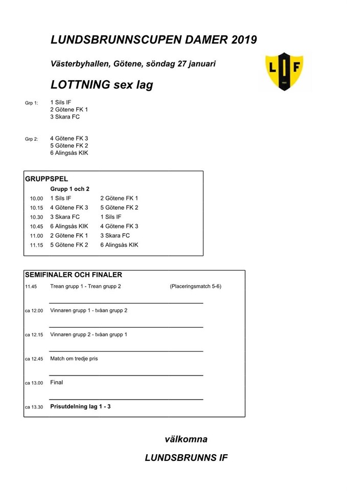 Välkomna till vår futsalcup för damer som spelas i Västerbyhallen söndag 27 januari mellan kl 10 och 14. Lundsbrunns IF 16 jan 2019 0kommentarer