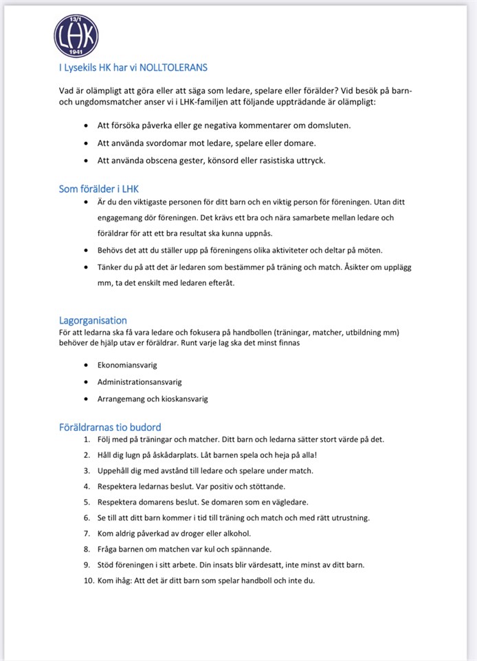 Vill med denna nyhet informera lite om föreningen och en del av ”kontraktet” mellan föreningen, er föräldrar och inte minst barnen :-) LHK:s policy (kan läsas på hemsidan), inleds med värdegrunden; Trygghet, Glädje, Utveckling & Respekt Nedan följer några tänkvärda utdrag från viktiga punkter för handbollslekis: ”Som förälder i LHK är du den VIKTIGASTE personen för ditt barn och en viktig person för föreningen. Utan ditt engagemang dör föreningen. Det krävs ett bra och nära samarbete mellan ledare och föräldrar för att ett bra resultat ska kunna uppnås”. ”Föräldrarnas 8e & 9e budord, Fråga ditt barn om träningen var kul och spännande samt Stöd föreningen i sitt arbete, din insats blir värdesatt inte minst av ditt barn”.