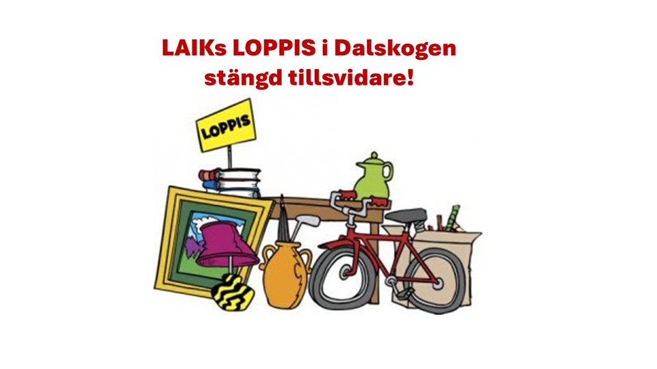 Öppnar 3/2 igen. LAIKs Loppis i Dalskogen är stängd tillsvidare pga vattenläcka. Vi kan tyvärr inte hämta prylar under denna tiden heller, eftersom vi inte har någon plats att ställa möblerna. Vi återkommer så snart vi vet när vi kan öppna igen. //Loppisgänget