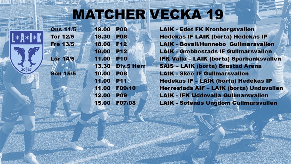 Denna veckan är det många härliga matcher att kolla på, varför inte besöka Gullmarsvallen på fredag och se P12 & F12 samtidigt eller Derbyt mot SAIS på Brastad Arena på lördag :) HEJA LAIK!!!