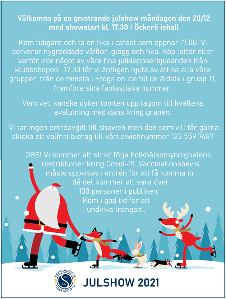 Hej Välkomna på julshow, se bifogad bild för inbjudan. Mer information kring klädsel och tider för samling för åkarna kommer inom kort. Vi kommer bjuda på en härlig julshow med alla våra åkare. Det blir sillotteri, chokladlotteri, fika, våfflor och mycket annat trevligt. Vi är väldigt glada över att få träffa er alla och vi vet att samtliga har längtat efter att äntligen få komma på show på riktigt. Vi vill dock observera er på att vi måste kontrollera covidbevis enligt gällande restriktioner för Covid-19. Ladda hem detta innan via e-hälsomyndigheten eller skriv ut och visa upp i entrén där gör en kontroll på samtliga åskådare från 18 år och äldre. Negativt provsvar gäller ej som covidbevis. Hälsningar tränarna och konståkningens arbetsgrupp M1 2 dec 2021 0kommentarer