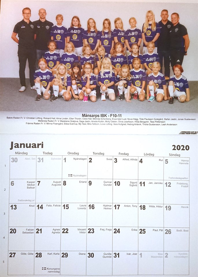 Vi har i dagarna fått kalendrar från Expressbild som skötte årets fotografering. För att undvika att vi får betala för alla kalendrar behöver vi veta hur många av er som är intresserade av en eller flera, därefter så returnerar vi alla överblivna kalendrar. Kostnaden för kalendern är 150 kr varav 50 kr går till vårt lag. Skriv i kommentarera nedan både om ni vill ha kalender/kalendrar eller inte (för att vi ska veta att alla fått infon) senast den 20:e December. Tack!