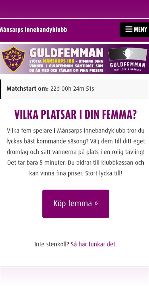 Guldfemman är tillbaka. I år med fler spelare, fler matcher och mer spänning. Vad är guldfemman? Guldfemman är en tävling där du skapar ett lag genom att köpa fem spelare från herrlaget (div 3). När serien startar börjar även själva tävlingen. Varje seriematch samlar dina spelare poäng till din guldfemma. Det lag som samlat ihop flest poäng efter säsongen vinner även hela tävlingen. Hur fungerar det? - Du börjar med att öppna ett konto, alt loggar in på ditt nuvarande. - Därefter väljer du ut fem spelare till din trupp. - För att göra din guldfemma mer unik ska du även rangordna dina spelare, samt välja ut en kapten. Både rangordningen och kaptensrollen påverkar dina spelares poäng efter match. - Byten får göras fram till första matchen, därefter är din femma låst. Det går låsa upp dina femma genom att köpa byten under säsongen för en liten summa. - Under säsongen följer du din femma utifrån hur dina spelare presterar. - Den aktuella tabellen uppdateras varje match och går att följa på hemsidan. - Femman med flest poäng efter säsongen 20/21 vinner tävlingen. Vad kostar det? Varje spelare har ett pris mellan 20-40:-. Dock finns det ett "tak" på 160:-, vilket innebär att du ex. inte kan köpa 5 spelare för 40:-. Under säsongen går det även att köpa byten, priset där varierar beroende på hur många byten du köper. Finns det något pris? Förstapriset är en säsongsbiljett till säsongen 21/22. Samt en signerad matchtröja. Ett stort lycka till! Länk till tävlingen: http://www.guldfemman.se/mansarps-innebandyklubb Till dig som vill läsa mer om tävlingen: http://www.guldfemman.se/mansarps-innebandyklubb/info/sa-funkar-det /Oscar Johansson