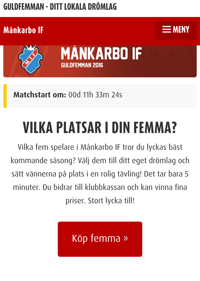 Nu är det sista chansen att registrera er i den roligaste tävlingen under säsongen www.guldfemman.se/mankarbo-if Poängräkningen börjar att gälla i kvällens bortamatch mot Vattholma i den andra omgången av division 5 norra och därmed stängs möjligheten till att registrera ett lag. Med 13 spelare skadade/sjuka så väntar två jobbiga matcher för våra herrlag. A-laget spelar ikväll borta mot Vattholma kl 18.45 medans U-laget har seriepremiär mot HÖFF på gimo konstgräs på lördag kl 16.30. Truppen till kvällens drabbning mot Vattholma: Kalle Persson Philip Larsson August Karlsson Daniel Mattsson Johan Ohlström Pontus Parling Wiktor Svensson Mattias Jansson Rikard Svensson Hugo Eriksson Oliver Keddyson Robin Andersson Max Bergström Martin Westin Simon Sjöberg Truppen till lördagens seriepremiär mot HÖFF: Joel Sandström Daniel Öhlund Max Bergström Niklas Karlsson Jonas Eriksson Oliver Keddyson Martin Westin Hugo Eriksson Felix Ingmarsson Emil Norlin Simon Sjöberg Jakob Svensson Herr 28 apr 2017 0kommentarer
