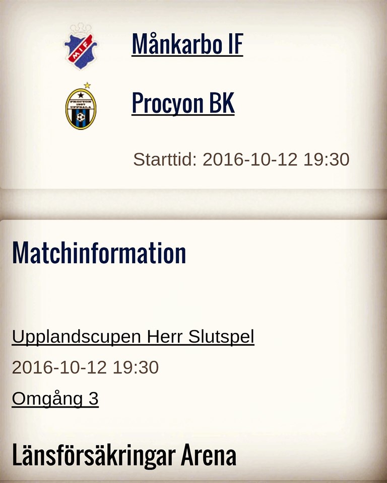 På Söndag kl 18:00, möter MIF herrar, Brottby SK i semifinal i Upplandscupen på Össeby IP. Laget kommer att åka buss till matchen och det finns 20 plaster kvar till eventuella supporters som vill följa med oss som stöd. Anmälan görs till Bergan via SMS på nummer 0708112102. Först till kvarn......... Herr 14 okt 2016 0kommentarer