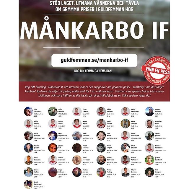 Vi kör guldfemman även i år, fast i år sponsrar du ännu mer till klubben per registrerat lag än tidigare år. Samtidigt som du är med och stöttar klubben, så är du även med och tävlar om 3000kr samt övriga priser. Gå in på www.guldfemman.se/mankarbo-if och registrera ditt lag.