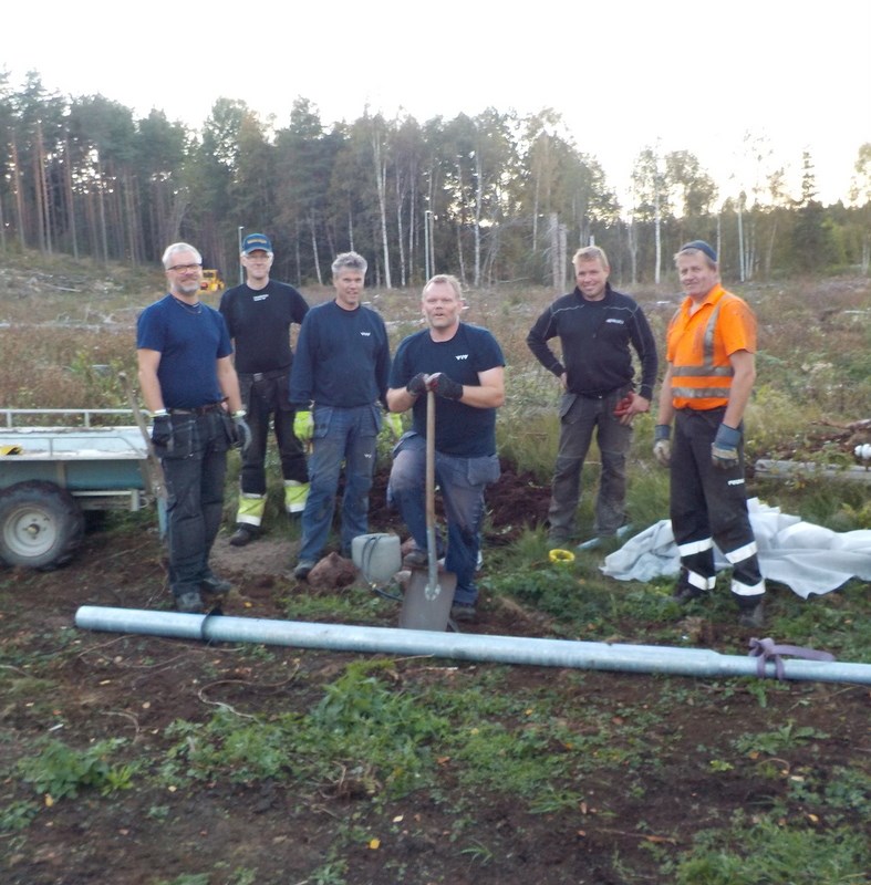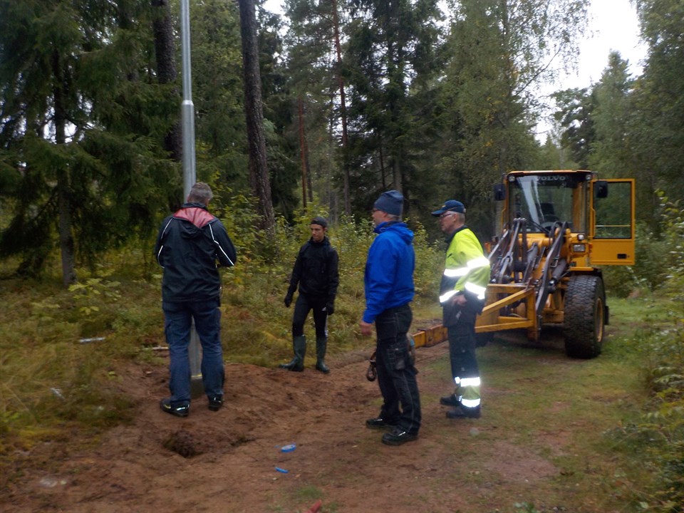 Nu är första stolpen av den nya belysningen på plats... Erik Sjöberg, Bernt Säfström, Per och Lukas Österlund fixade den...