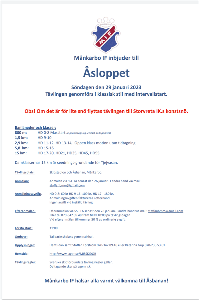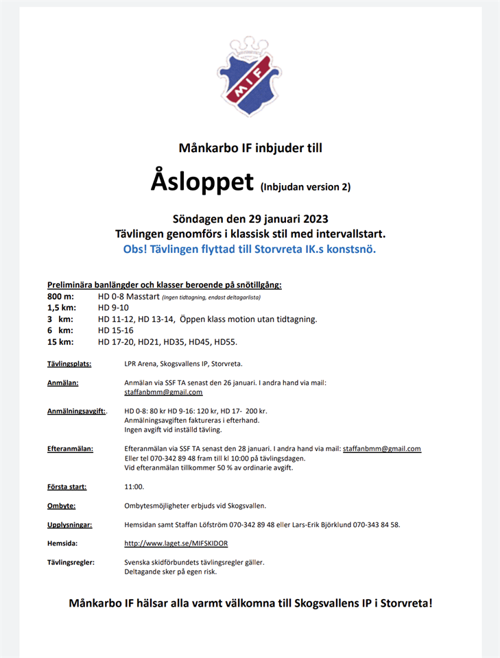 Vi har beslutat att flytta Åsloppet till LPR Arena och Skogsvallens IP i Storvreta. Här kommer en ny inbjudan, klicka på länk nedan eller se foto i nyheten. Inbjudan Åsloppet 2023 version 2 Vi hoppas att få till en bra tävling i Storvreta./ MIF Skidor Skidsektion 17 jan 2023 0kommentarer