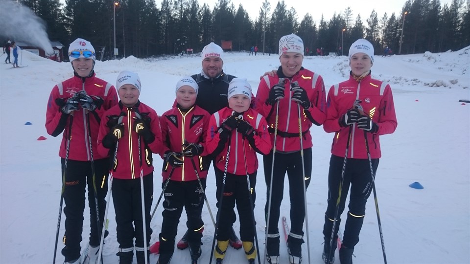 Här bild av hela Månkarbos skidåkare på USF:s läger i Orsa... ledare Staffan Löfström, Oskar-Julia-Johan Löfström, Samuel Linde, Billy o Theo Ingemarsson