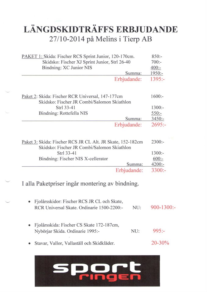 Den 27 oktober kl 18 - 21 är det skidträff vid Melins i Tierp. De har då erbjudanden och bra rabatter på längdutrustning. Se erbjudanden i fotot intill samt i annonsbladet. Skidsektion 22 okt 2014 0kommentarer