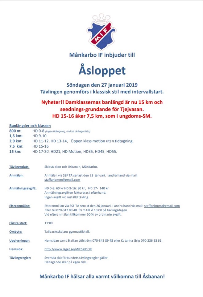 Välkomna till Åsloppet i Månkarbo i helgen. Spåren är jättefina och det ser ut att bli en härlig vinterdag. Det går bra att anmäla sig via tävlingskalendern till kl 12:00 imorgon och sedan via mail eller telefon fram till kl 10:00 på söndag. / MIF Skidor