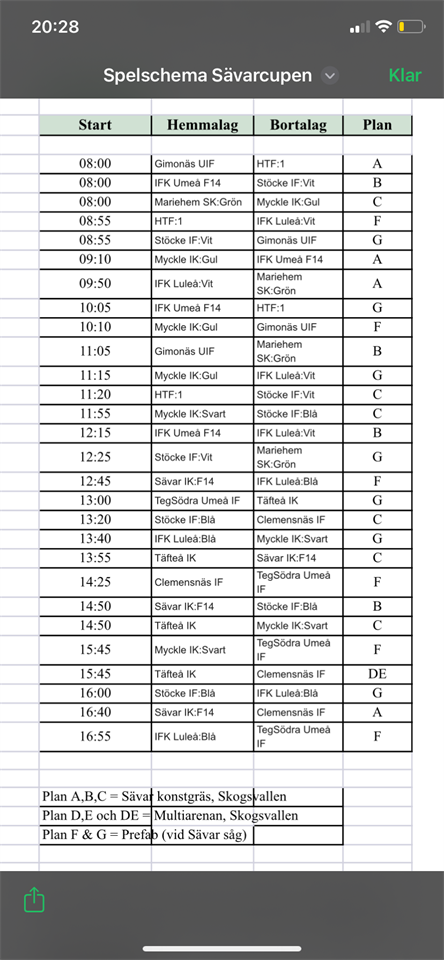 Myckle gul. Tränare- Majsan och Sofia Spelare- Signe, Ebba M, Luna, Maja, Moa, Alva, Otilia, Emilia, Ebba O, Celina, Greta, Saga 8.00 Mariehem - Myckle plan C 9.10 Myckle - IFK Umeå plan A 10.10 Myckle - Gimonäs plan F 11.15 Myckle - IFK Luleå Myckle svart. Tränare- Johanna och Nina Spelare- Ines, Agnes, Bonnie, Ester, Ella, Elsa H, Elsa S, Ina, Ture, Lily, Stina Bella 11.55 Myckle - Stöcke plan C 13.40 IFK Luleå - Myckle plan G 14.50 Täfteå - Myckle plan C 15.45 Myckle - Teg Södra plan F