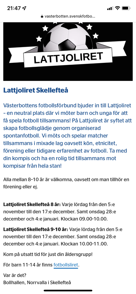 Fotbollsförbundet erbjuder gratis att komma och spela fotboll i bollhallen i november och några datum till. Se bifogad bild eller sök på lattjoliret Västerbotten för mer information. Roligt och bra initiativ! Mix14 14 okt 2022 0kommentarer