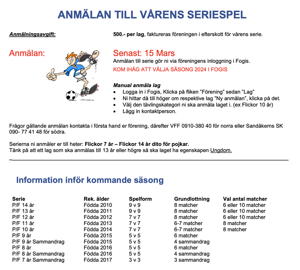 Skickar en påminnelse att 15 mars är sista datum för att anmäla lag till seriespel. Ledarsidan 28 feb 2024 0kommentarer
