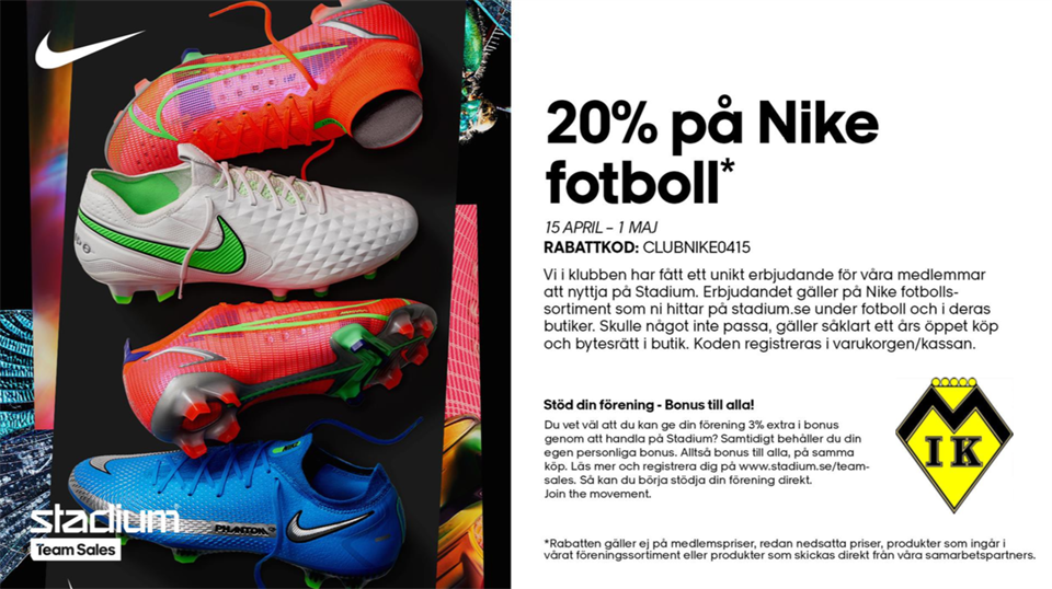 Under perioden 15/4 - 1/5 får spelar och ledar i Myckle 20% rabatt på fotbollsskor från Nike. Se bild för instruktioner. Lägg ut detta på era lagsidor så att alla får möjlighet att utnyttja denna rabatt. Lägger upp bilden under Dokument ifall ni vill ha möjlighet att skicka ut den till alla.