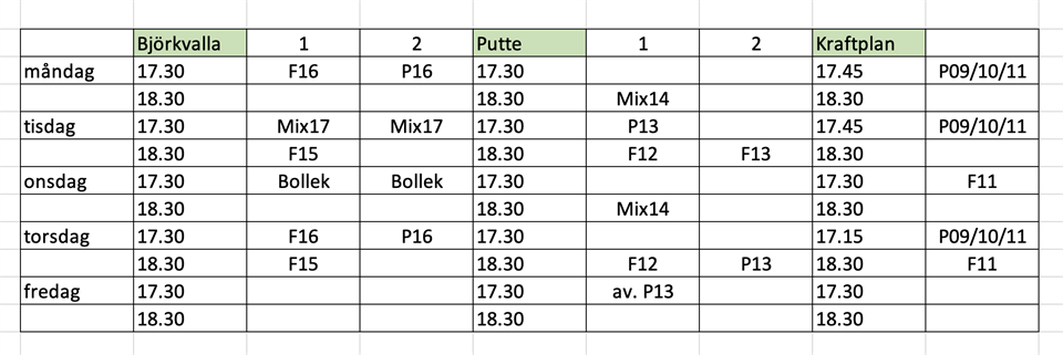 Äntligen äntligen börjar det närma sig aktivitet på Myckle IP. Putte och Björkvalla är kritade. i veckan fortsätter kritning av Kraftplan, Rickvalla och Stureplan. Från kommande veckan (v. 22) är det möjligt att börja träna på Myckle, MEN då planerna fortfarande håller på att växa till sig är det bra om vi avlastar så mycket som möjligt. Iaf nån vecka till. Därför vill vi att ni som har tider på Lejonström fortsätter träna där, så får de lag som inte har några träningstider nu träna på Myckle. Har ni t.ex. bara en träning på Lejonström är det okej att träna en andra träning på Myckle. Men använd Lejonström så långt det är möjligt. Matcher spelar vi på Lejonström fram till helgen 2/6 (kommande helg), därför bör vi även kunna spela matcher på Lejonström. Ni som inte har några träningar på Lejonström nu, ni kan börja på Myckle, men skulle ni hitta en grönyta utanför planerna använd gärna den för övningar. Se bild för de tider som ni anmälde in på fördelningsmötet.